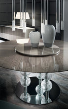 Pasha is a luxurious table that celebrates Italian craftsmanship, featuring a base made of steel tubes adorned with elegant hand-blown Murano crystal spheres. These exquisite details underscore the richness of its design.