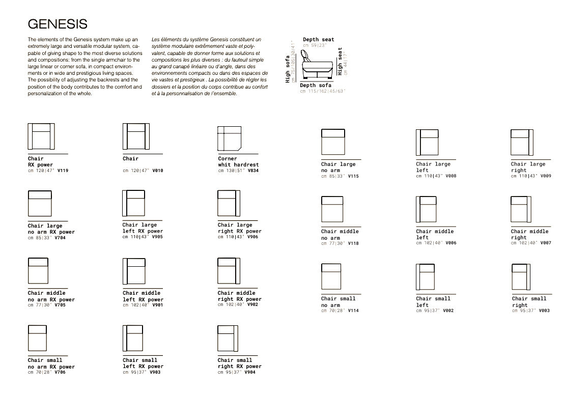 The elements of the Genesis system make up an extremely large and versatile modular system, capable of giving shape to the most diverse solutions and compositions: from the single armchair to the large linear or corner sofa, in compact environments or in wide and prestigious living spaces. The possibility of adjusting the backrests and the position of the body contributes to the comfort and personalization of the whole.