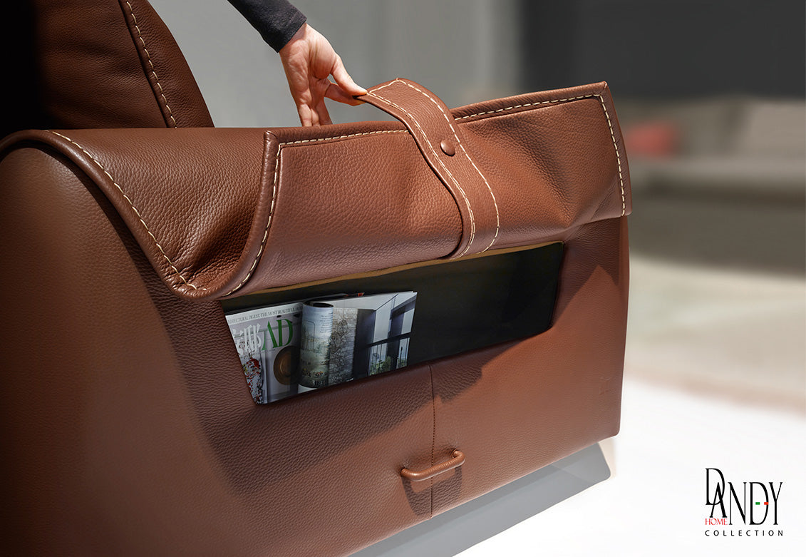 Modern leather sofa, that epitomizes the fusion between the world of fashion and the sophisticated design of the Dandy range. One standout hallmark of this modern design sofa is its armrest. Basing ourselves on an elegant handbag, we recreated and sculpted this fashionable aesthetic detail, turning it into a major feature and boosting practicality with the armrest compartment on the side of the sofa.