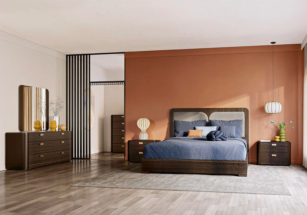 The Appia Dresser merges generous storage with architectural purity. Six full-extension drawers (or an alternate four-drawer variant, depending on your region) offer ample space, framed by a clean, unadorned façade. The drawer fronts echo the vertical groove motif from the bed, creating visual continuity across the collection.