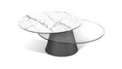 The Girotondo Coffee Table, an inventive creation by Naos, leaves a lasting impression in any modern home. Boasting two swiveling tops, this table opens by rotating the main top, revealing the lower one in a smooth and seamless movement. The clever design transforms the table into an extended version with ease.