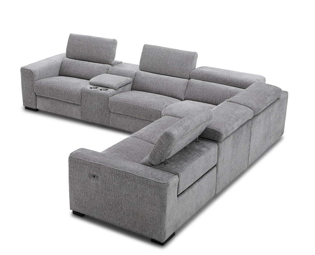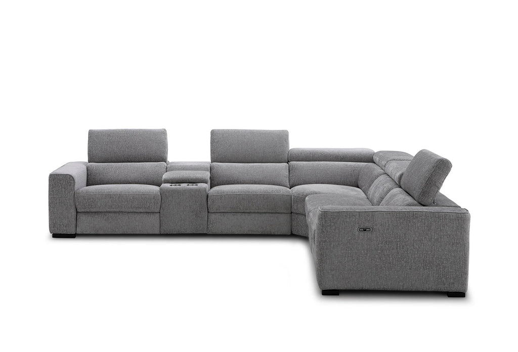 Visually Clean Lines and spacious seats set the Picasso apart from the standard. This iconic sectional features 3 powered recliners and headrests for maximum comfort. Crafted from premium fabric all around, this 6 piece sectional features a convenient console with two cup holders plus storage, 2 corner-end recliners, 1 armless recliner, 1 stationary armless & a plush corner cushion for ultra comfort, and a solid oak frame to ensure long-lasting use. Is is available in fabric in Sand, Light and Dark Grey.The leather version is available in caramel, dark grey & silver grey.